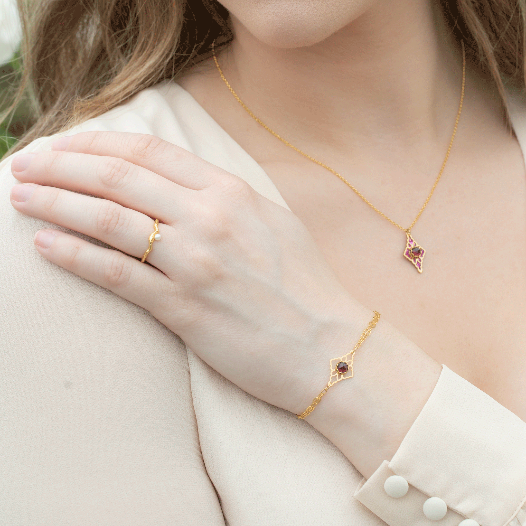 There's something deeply romantic about jewelry designed to be understood by only one other person. Today's version? Pieces that reveal themselves slowly, that reward proximity and attention. The Esme Earrings with garnet centers and filigree flourish show off full artistry only at intimate range. And just as sweetly subtle, the Charming Hearts Bracelet is quiet enough to go unnoticed by a room full of people, but unmistakable to the one person who matters. This is jewelry as a coded message, a stolen glance, as something precious meant to stay between two people.
