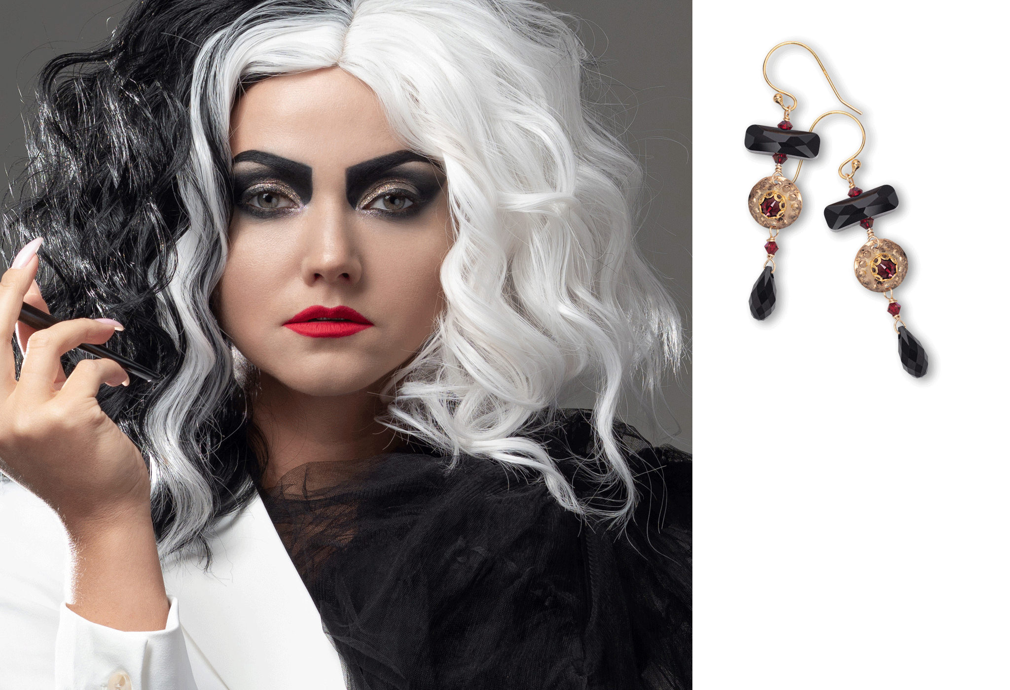 Cruella lived in extremes. Black and white were not fashion choices but a worldview. She smoked, schemed, and sped through London in a wardrobe that defined 1960s excess. Her chill surfaces in the Riverwind Earrings in Tidal Teal or the Kensington Earrings in Scarlet. Pair silver with silver, or mix metals for sharper effect. These pieces mirror her sharp confidence, made for the villain who goes after what she wants and never apologizes for taking it.