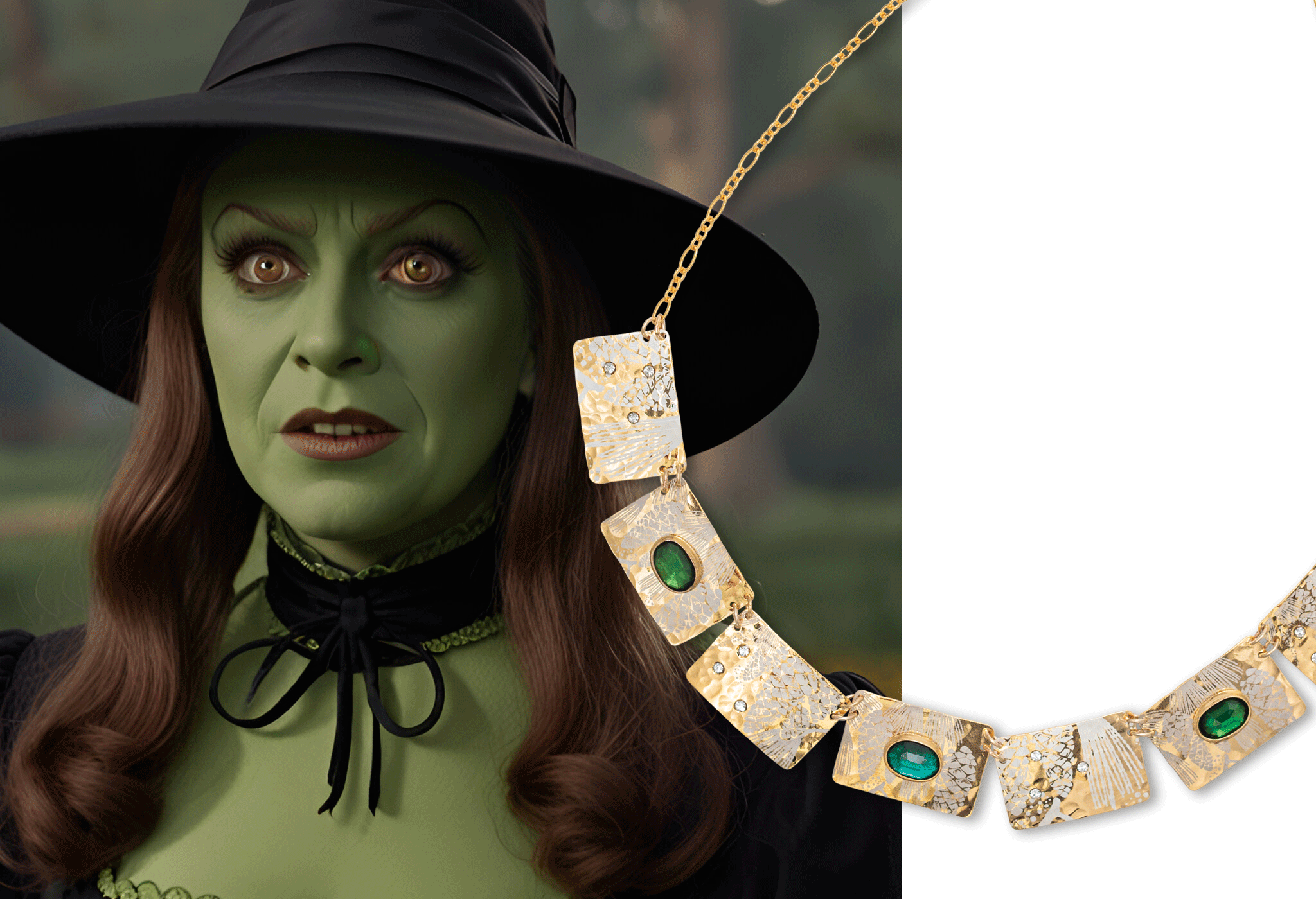 The Wicked Witch perfected branding. Green skin became an emblem of fear. Black robes set the stage for her dominance. Her legacy glows in the Gilded Petra Necklace and the Bella Butterfly Pendant Necklace in Green Flash.These aren’t the pastel greens of spring but jewel-toned shades of mischief and envy. Each piece captures the Witch's theatrical flair with the understanding that sometimes you need to make a dramatic entrance on a broomstick.